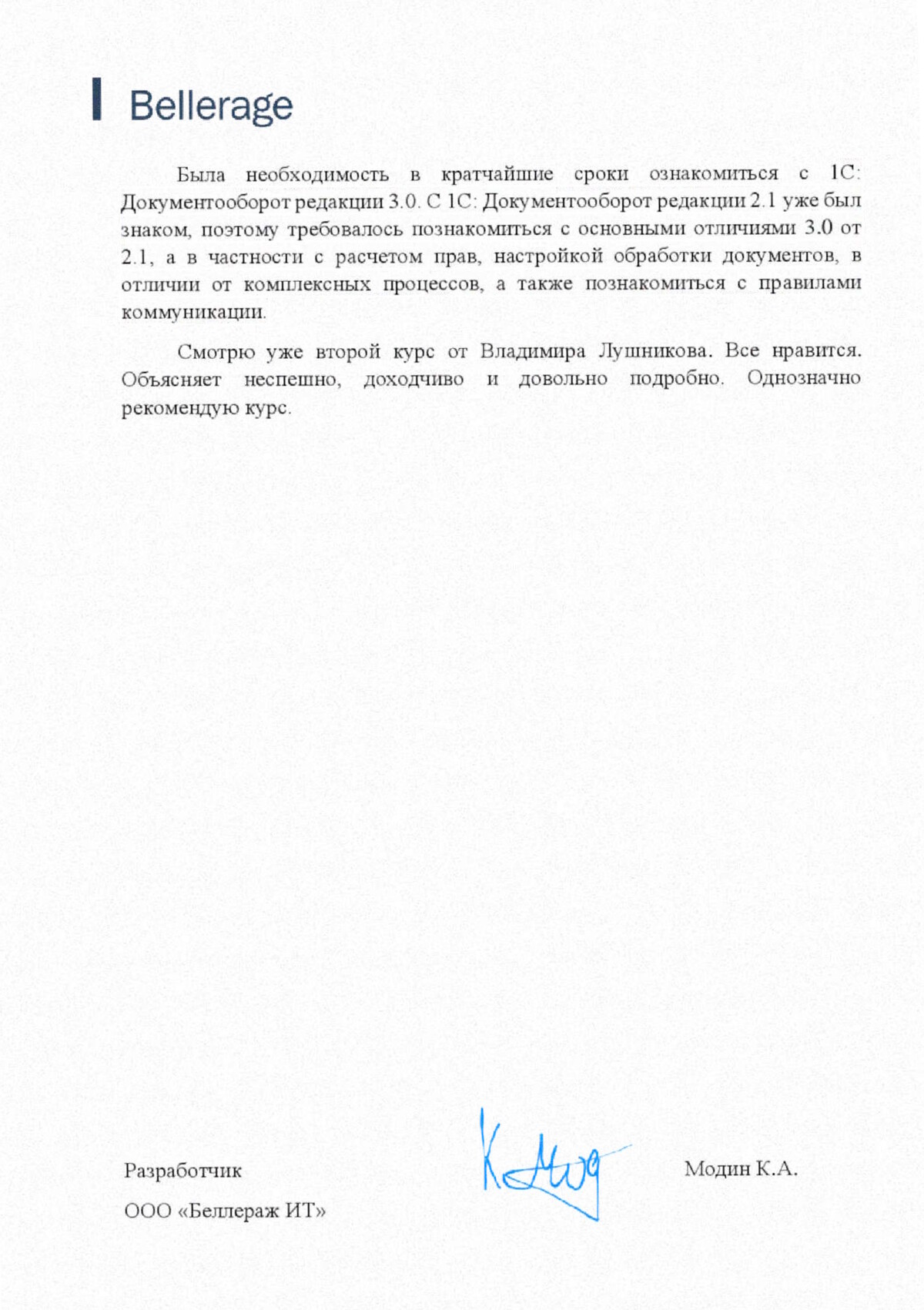 - Сертификат Магистра 1С:Документооборота (при условии правильного выполнения всех контрольных работ)