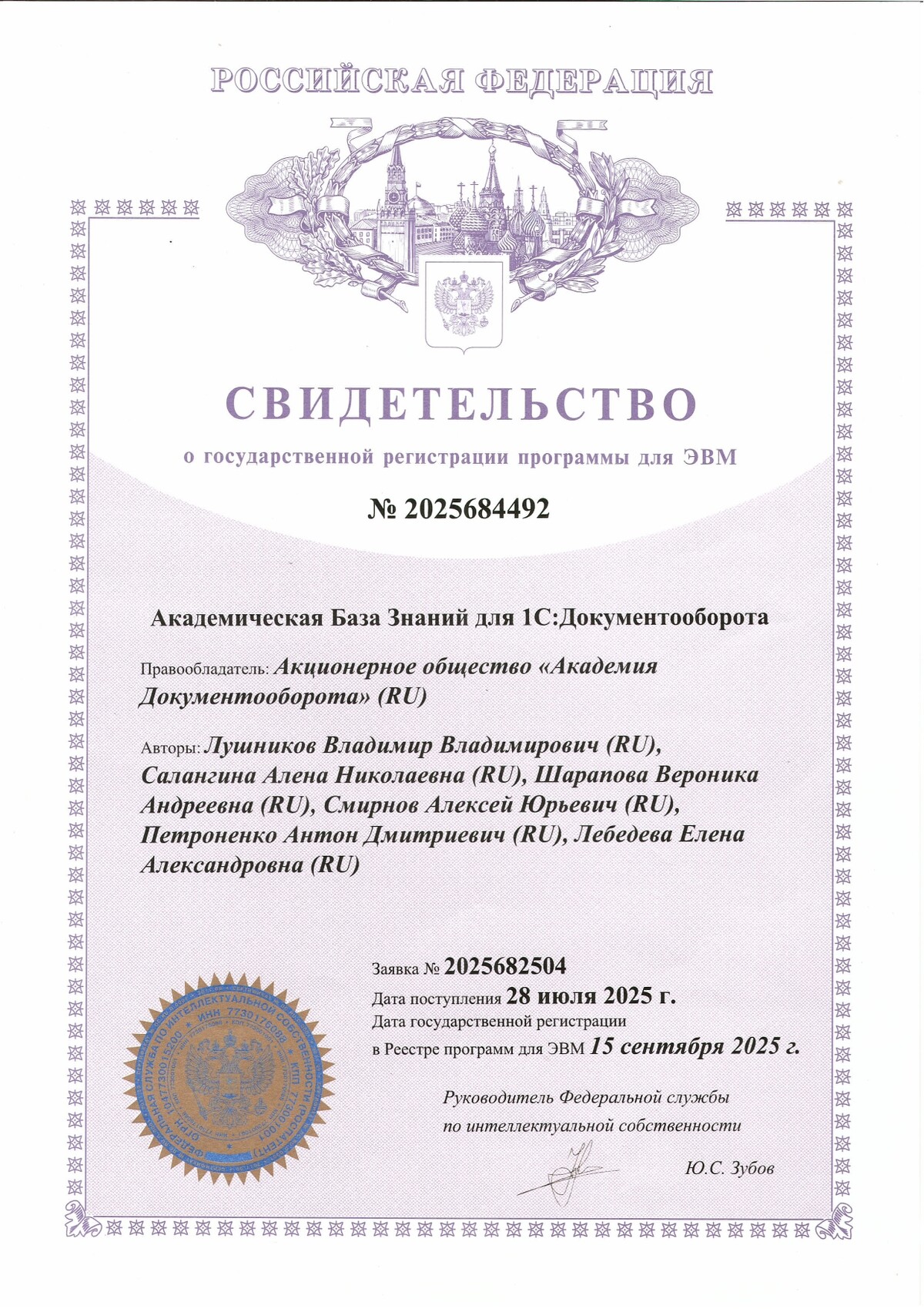 Академическая База Знаний — зарегистрированное российское ПО для 1С:Документооборота