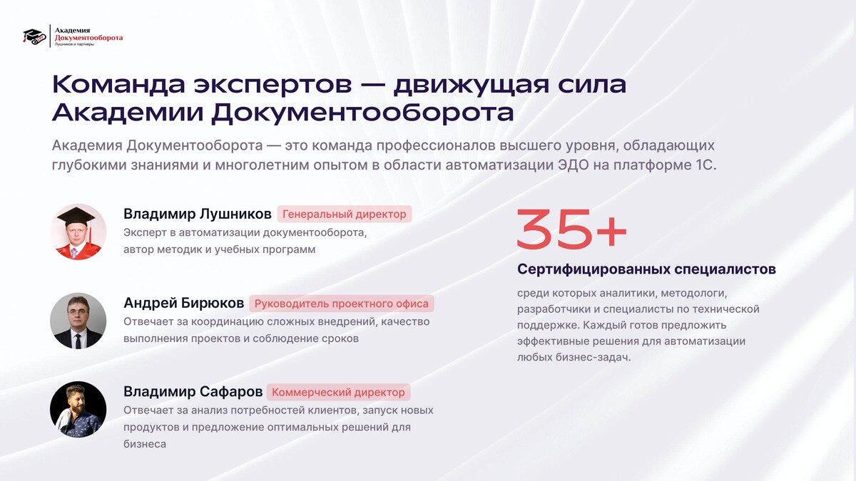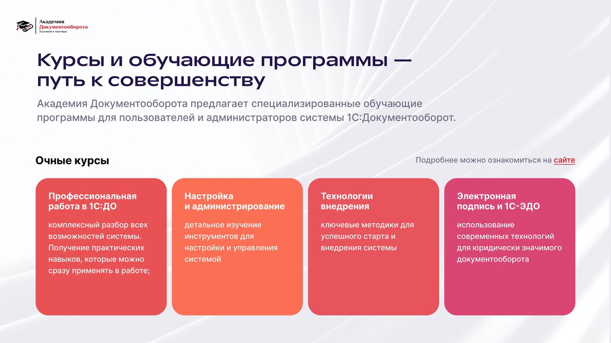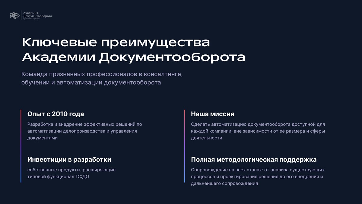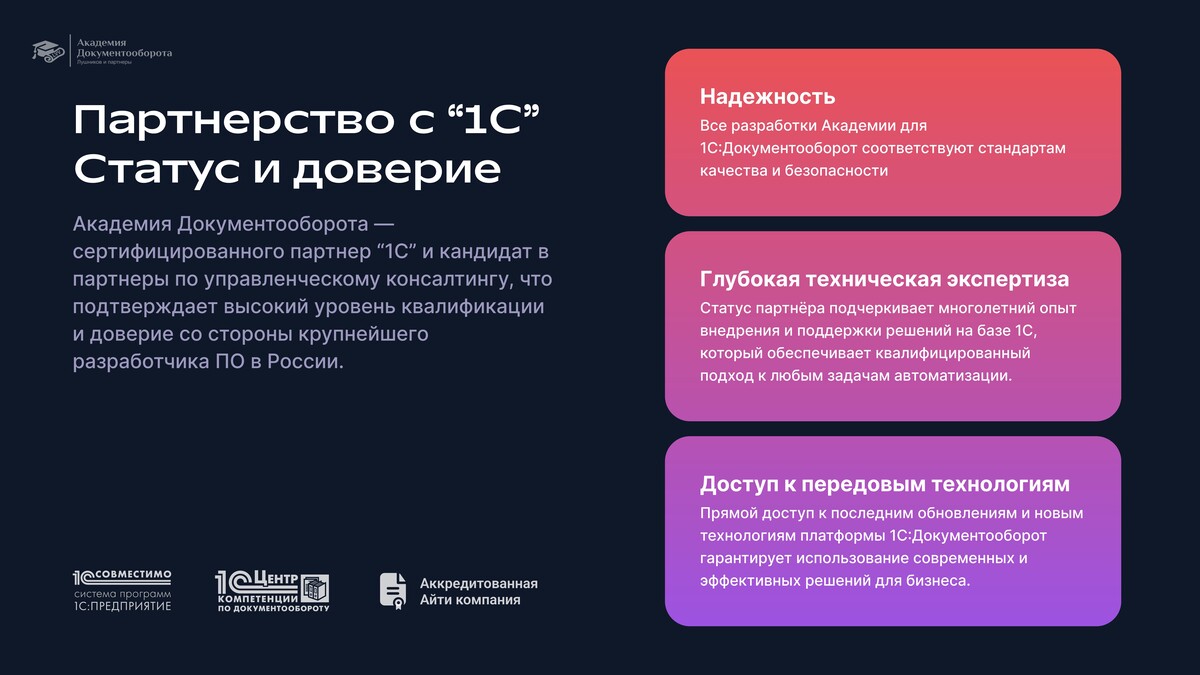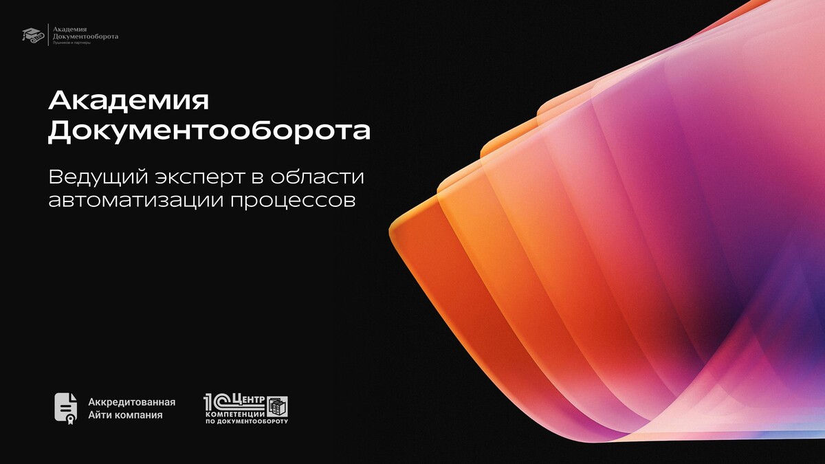 Академия Документооборота — это аккредитованная ИТ-компания и сертифицированный партнёр 1С, специализирующаяся на автоматизации документооборота с 2010 года.