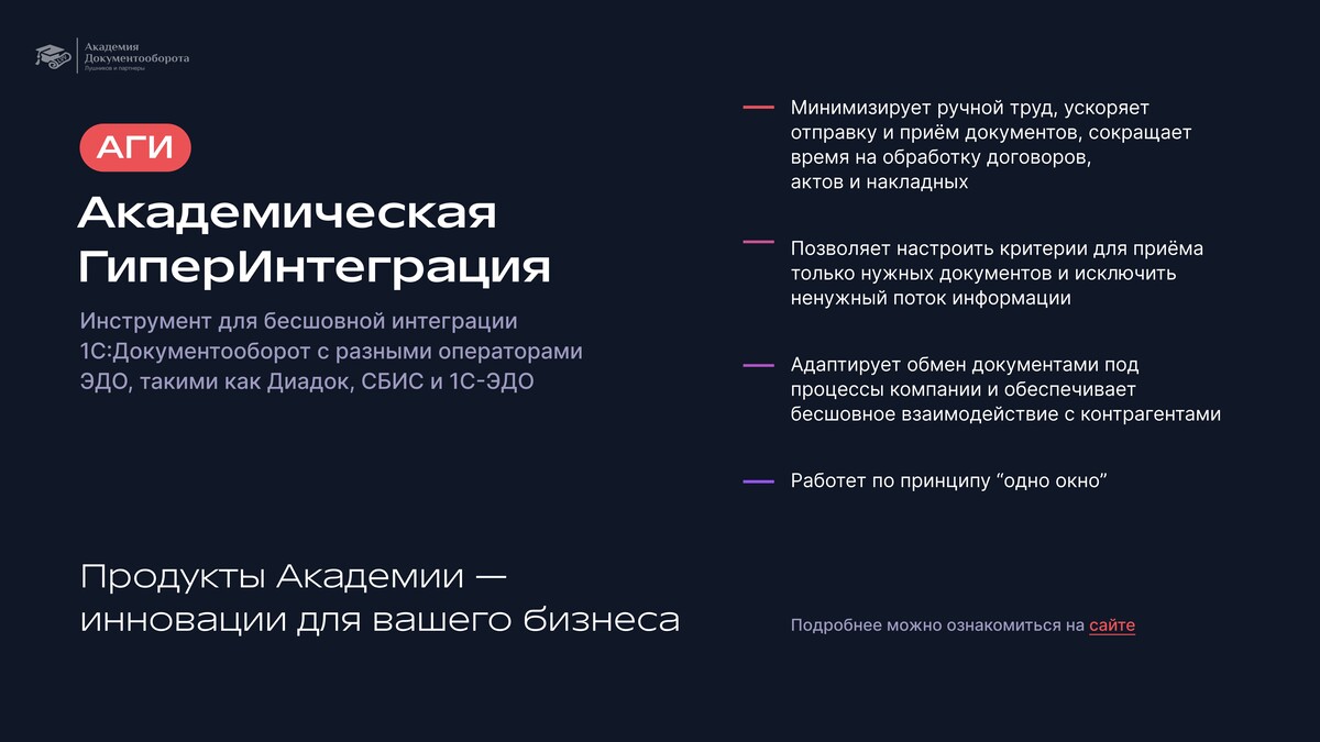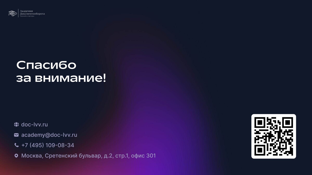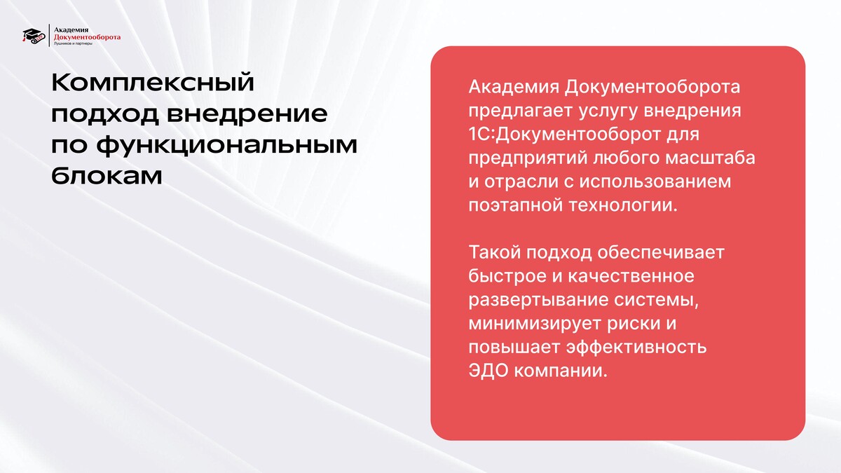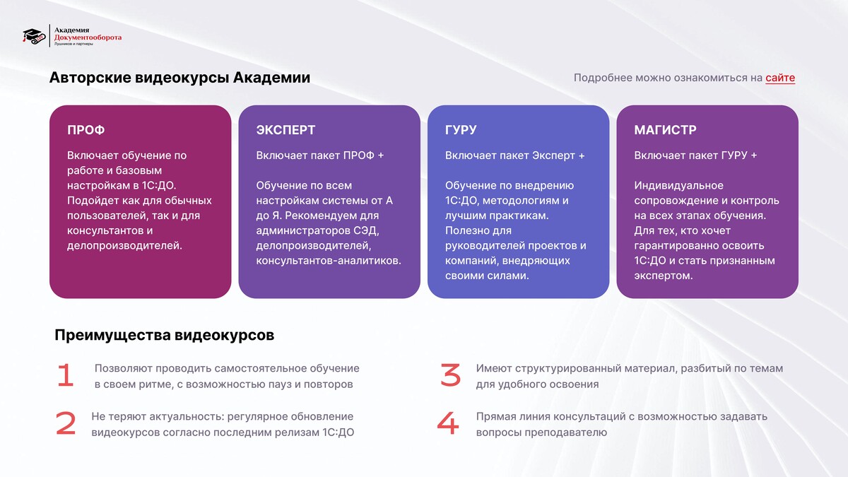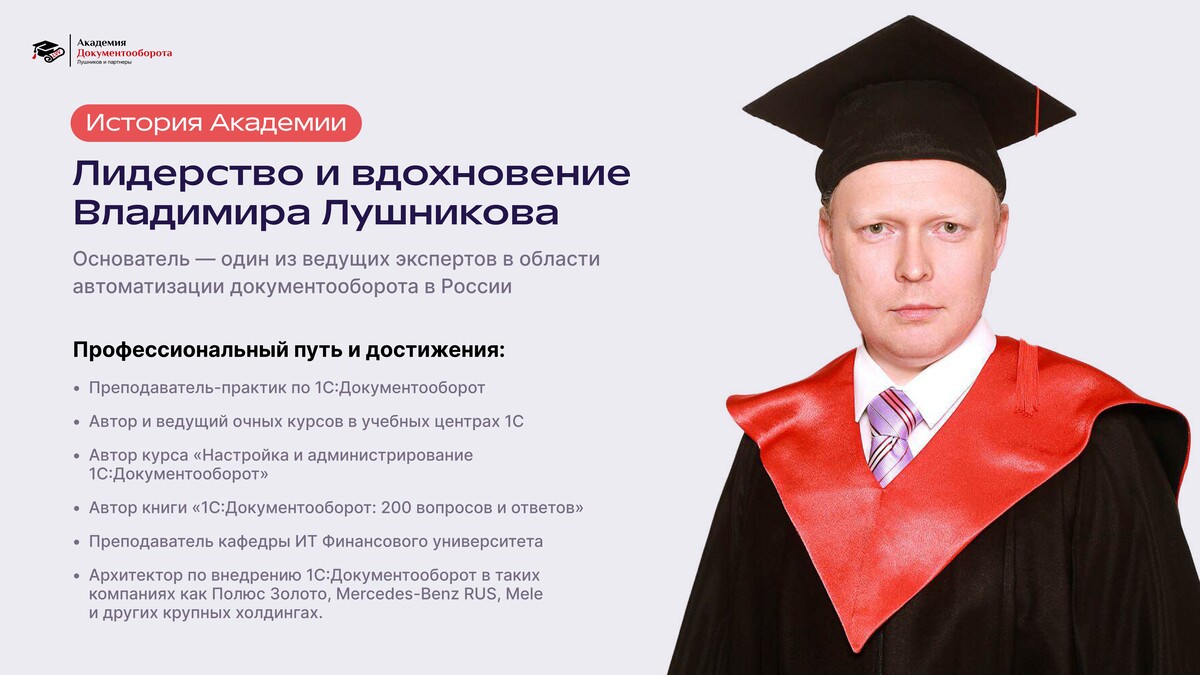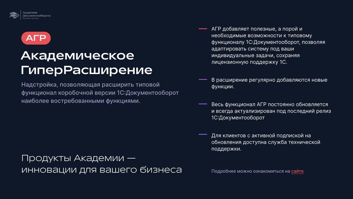 Академия Документооборота — это аккредитованная ИТ-компания и сертифицированный партнёр 1С, специализирующаяся на автоматизации документооборота с 2010 года.