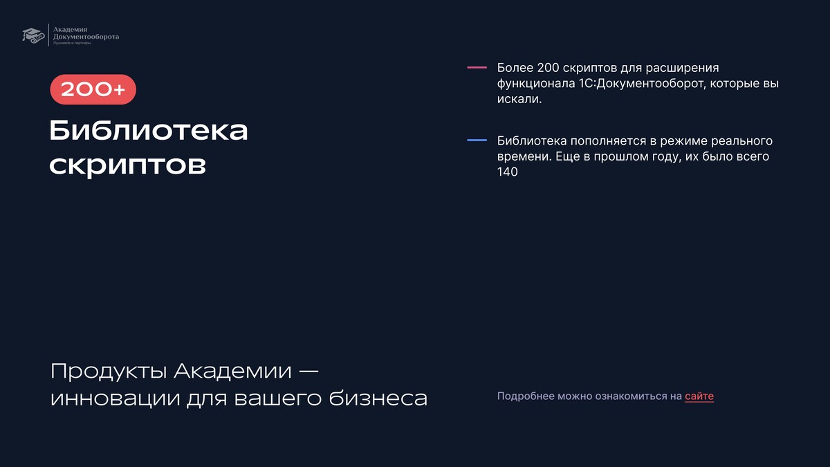 Академия активно инвестирует в собственные продукты — от расширений для 1С:ДО до авторской библиотеки скриптов. Кроме внедрения, мы обучаем: очные и видеокурсы Академии проходят более 1000 человек в год. Наш подход — это методологическая поддержка на всех этапах и персонализированные решения для каждого клиента.